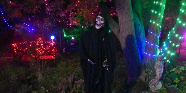 Osvětlená zahrada s halloweenskou tematikou a s řadou i animovaných strašidel.