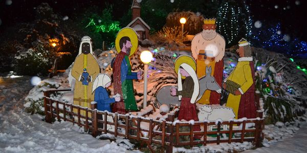Kouzelně osvětlená zahrada s vánoční tematikou.